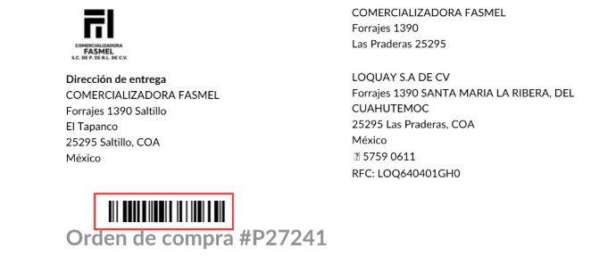 Escanea o escribe el numero de orden de compra, ejemplo, P27241, y da clic en Enviar. Si la paquetería que entrega el pedido no cuenta con la orden de compra, comunícate con el departamento de Compras al número 8446621929
